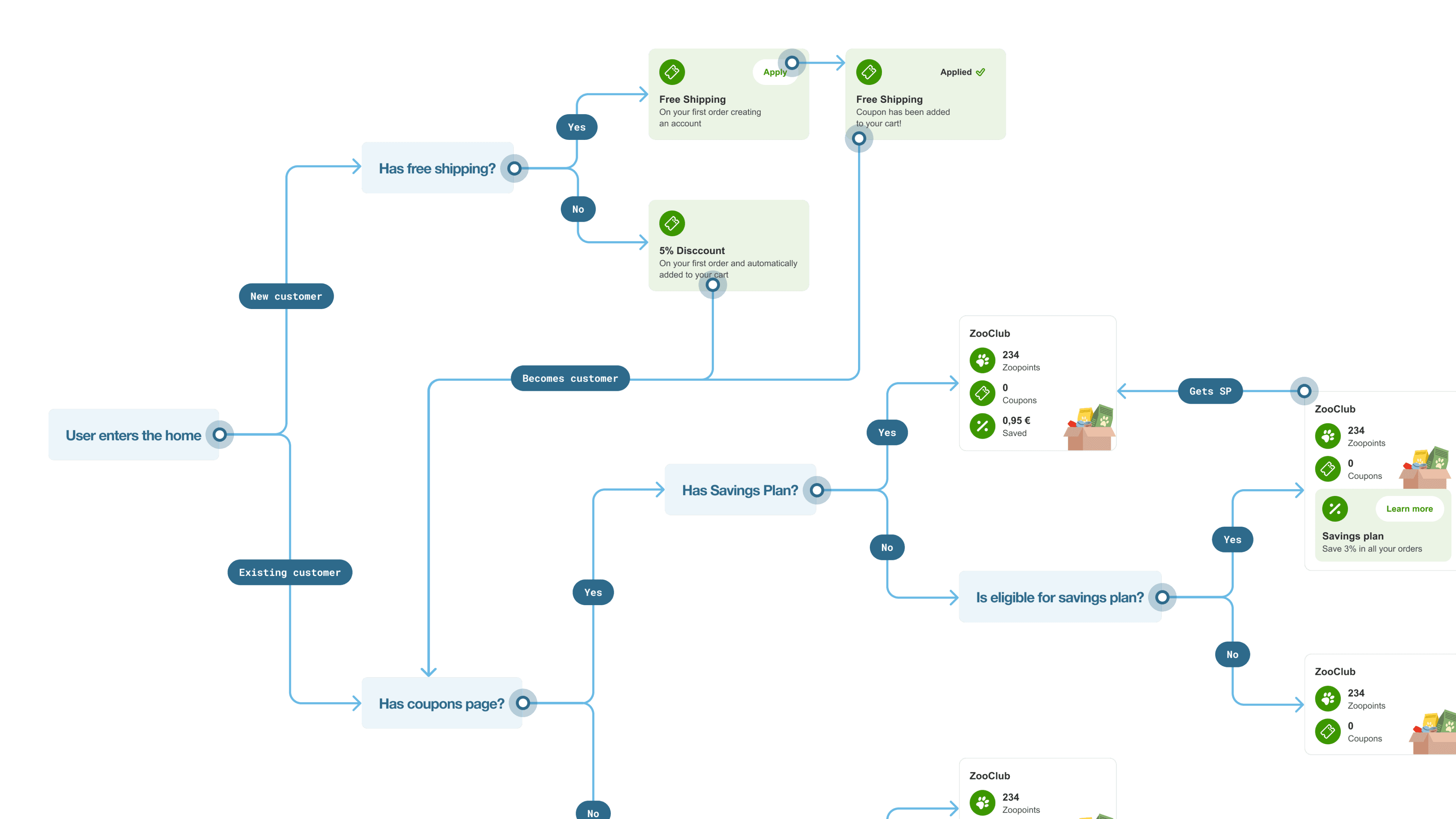Since Zoopoints, coupons, and the Savings Plan were managed by different product owners, I had to facilitate a collaborative process to determine the hierarchy of information across the Loyalty team. We had to decide which "state" took priority for the user at any given time. For example, if a user was eligible for both a new coupon and a Savings Plan renewal, we needed a logical framework to ensure we were showing the most relevant offer without cluttering the interface.